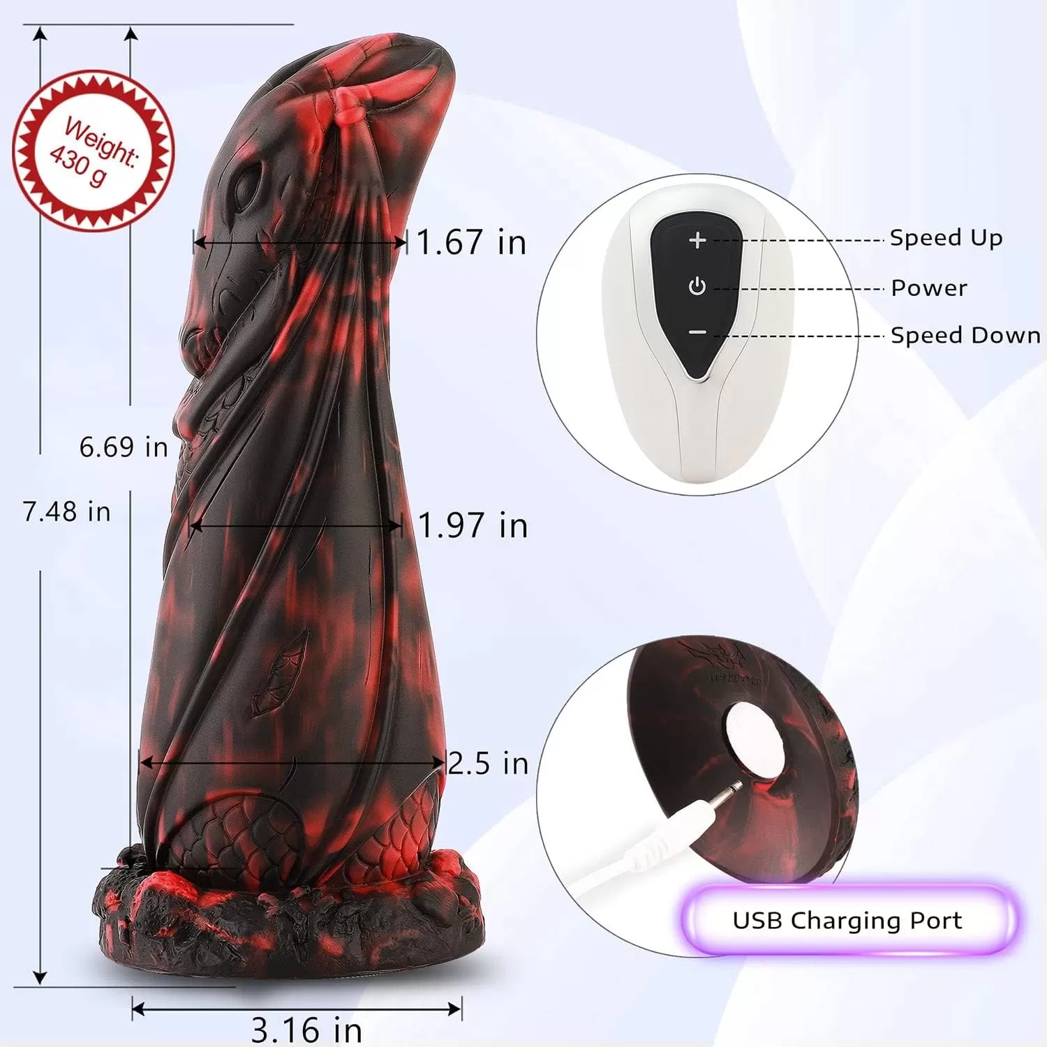 FATASTIC DRAGON DESIGN - Total length of this lifelike dildo is 7.48 in, insertable length: 6.89 in, max diameter: 2.56 in, net weight: 430 g. It has tapered head, great textures, easy to enter and provide special feeling