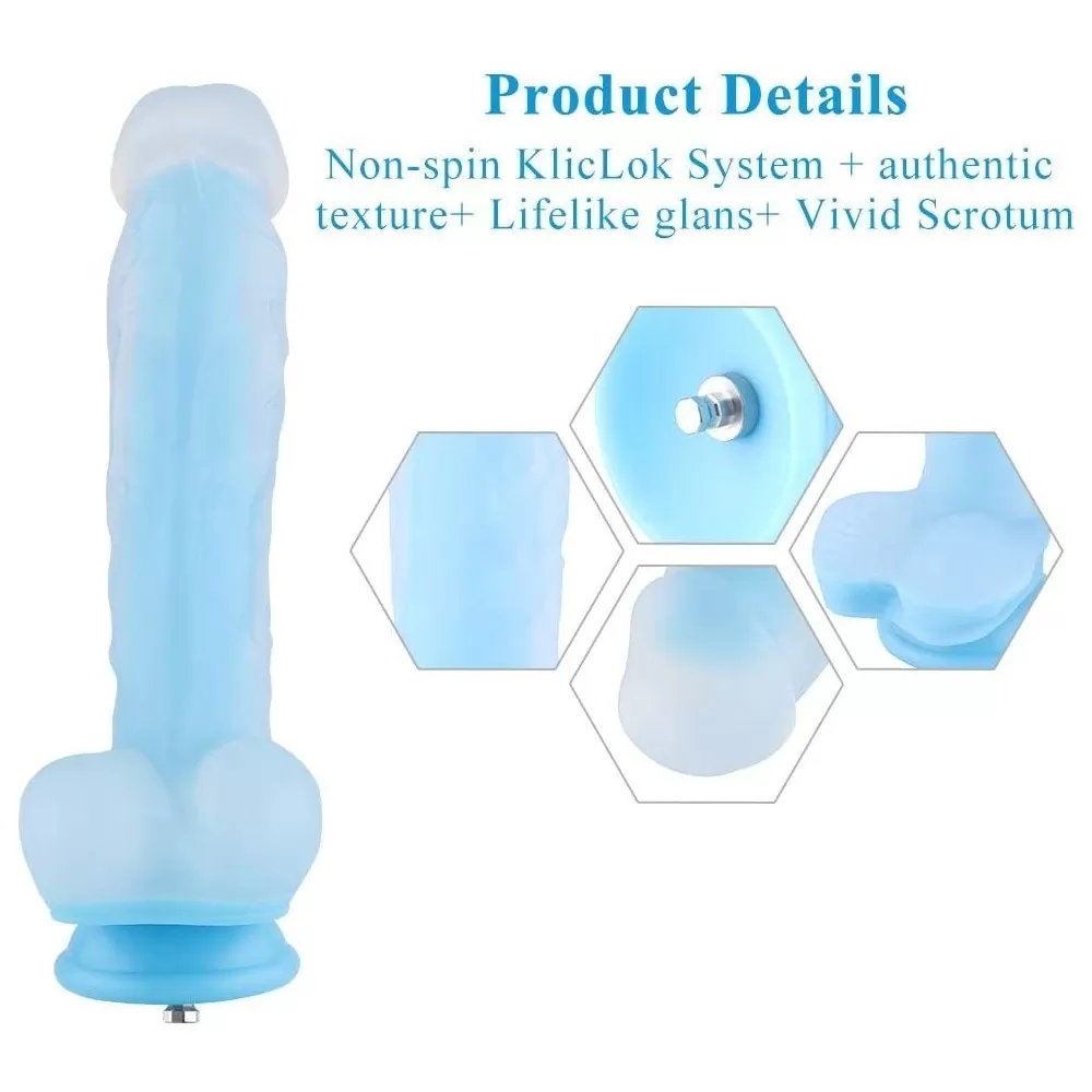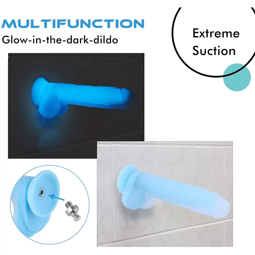 Glow in the dark smooth dicks with balls and suction cup, never lose your toy in bed again. Removable KlicLok system male part make it even harness compatible. Made from glow-in-the-dark,flexible silicone with realistic veins, firm balls and rounded head this suction cup dildo is one hell of a glow-stick, Blue light in the dark. Large glowing life-like shaped dong for ultimate pleasure.